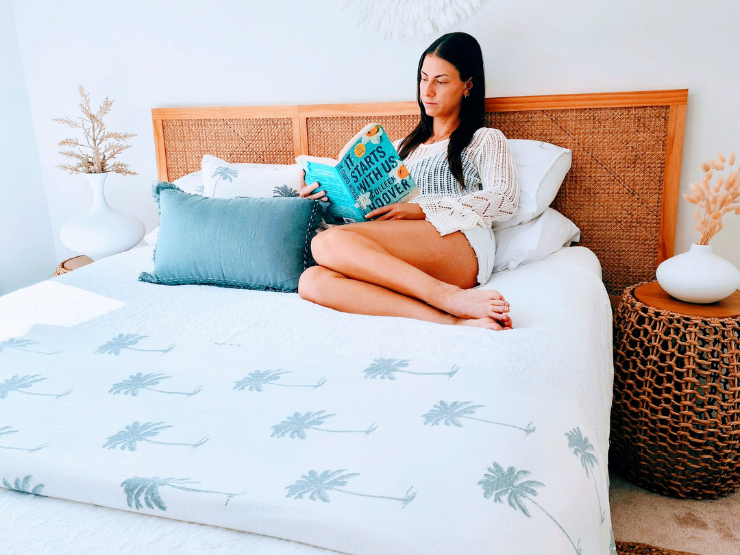 Escape to paradise with tropical palm prints, soft textures, and earthy hues — the perfect boho bed linen for relaxed coastal living.