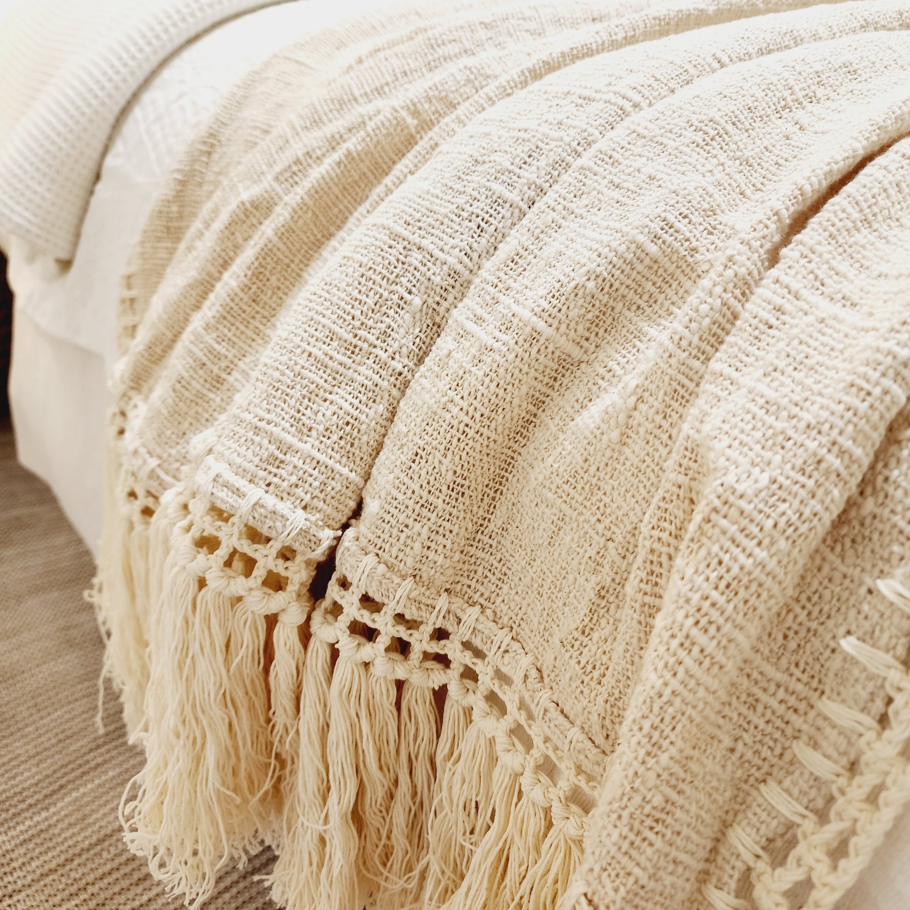 PLEASE READ: Our Island Luxe Throw Blanket is handmade from slub cotton which has varying thickness, resulting in a textured fabric with raised threads that create a visually interesting surface with a unique, organic aesthetic. Small variations may occur in the material. Any minor flaws and imperfections are characteristic of the materials and only add to the beauty and character of the product.