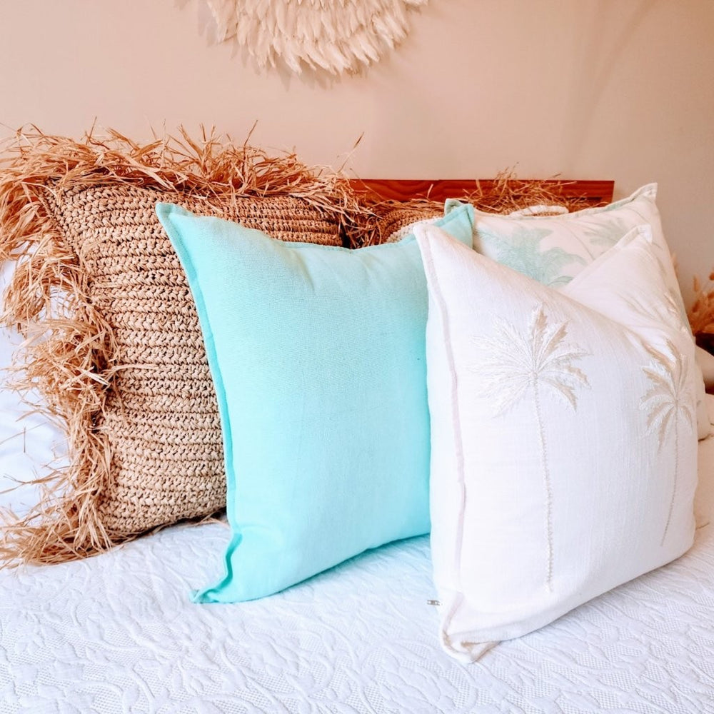 Reminiscent of turquoise waters, our Aqua Azul cushion cover is made from high quality linen and pairs beautifully with our Maldives Raffia cushion cover, our La Palma cushion cover and many others in our stunning range.