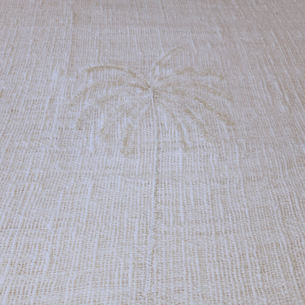 Our Coco Luxe Throw Blanket is lovingly made by hand from natural cotton and features beautiful embroidered palm trees with tassels on two sides. A luxurious, natural throw blanket to elevate your bedroom or sofa display.