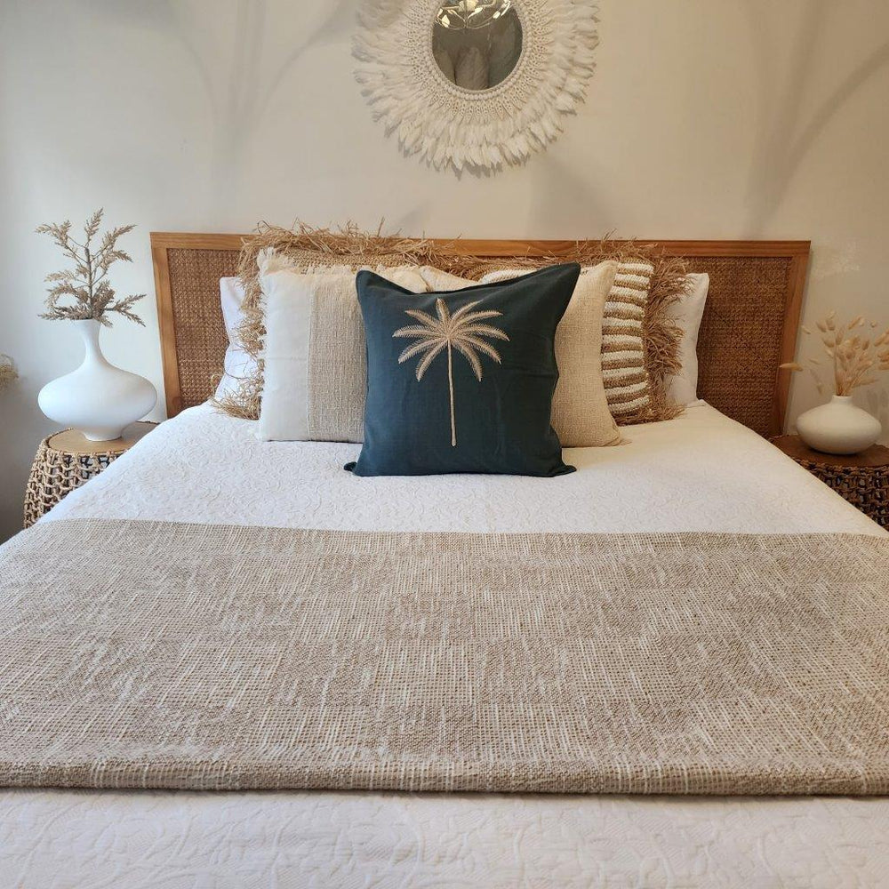 Evoking the blue of the sky and sea, our Curacao Palm cushion cover adds elegance and compliments your coastal styling. Featuring an embroidered palm tree in a golden hue and made from high quality linen cotton, it pairs beautifully with our Maldives Raffia cushion cover, our Oceanside cushion cover and many others in our stunning range.