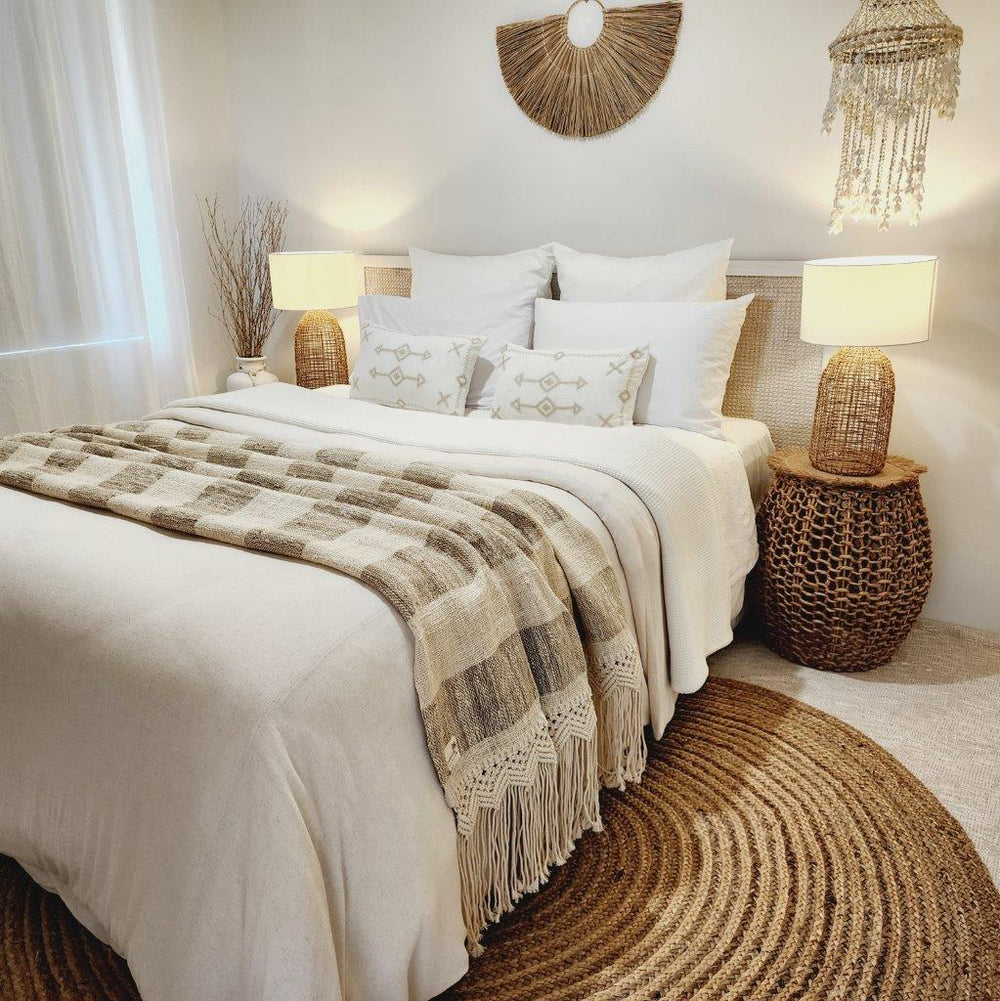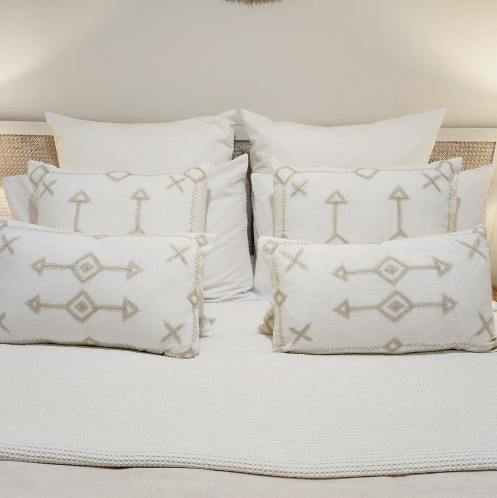 A versatile and stylish accent, our Kasha Cushion Cover brings a touch of bohemian spirit to any interior. Crafted from soft white cotton, this cushion features a delicate embroidered diamond and arrow motif in neutral sand tones. The geometric design adds gentle structure and movement, reminiscent of handwoven tribal patterns found in coastal retreats around the world.