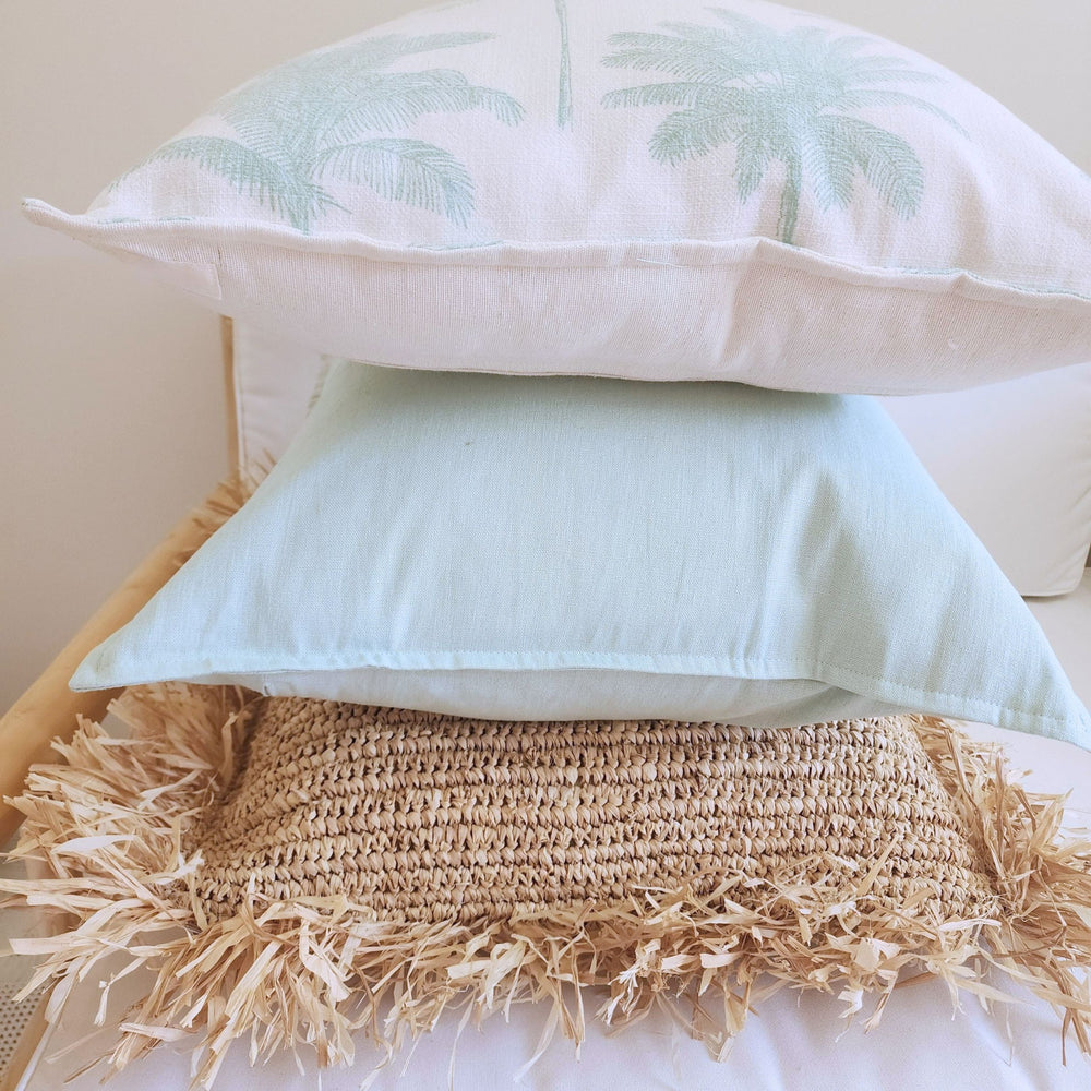 Get that Island Luxe feeling and add a stylish touch to your room with this beautiful aqua palm print cushion cover. Crafted from high quality linen cotton, our La Palma cushion cover is the perfect addition to add coastal elegance in any room! Pairs beautifully with our Maldives Raffia Cushion Cover, our Aqua Azul Cushion Cover and most of our stunning cushion cover range.