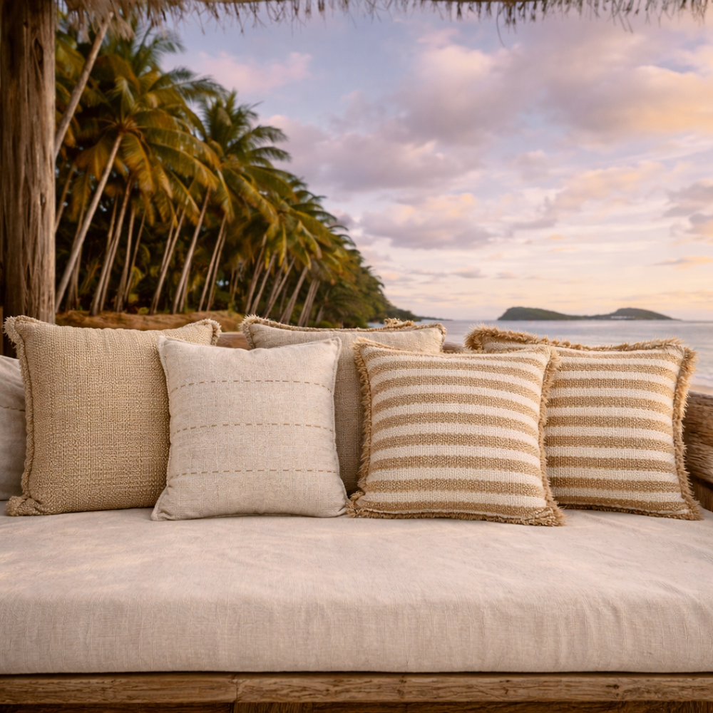 Every day should be a beach day and our Maldives Raffia Stripe Cushion Covers have us dreaming of thatched tropical huts and cocktails by the beach. These beautifully handwoven raffia cushion covers with a raw fringe will add a natural element to your cushion styling.