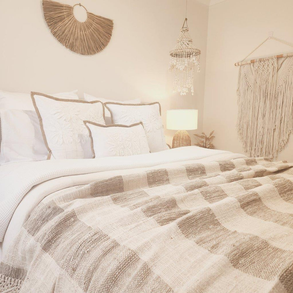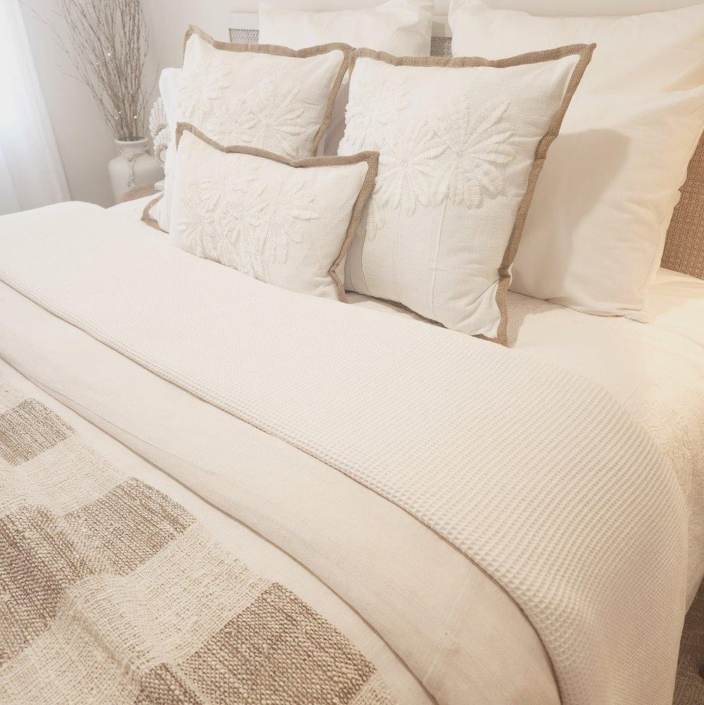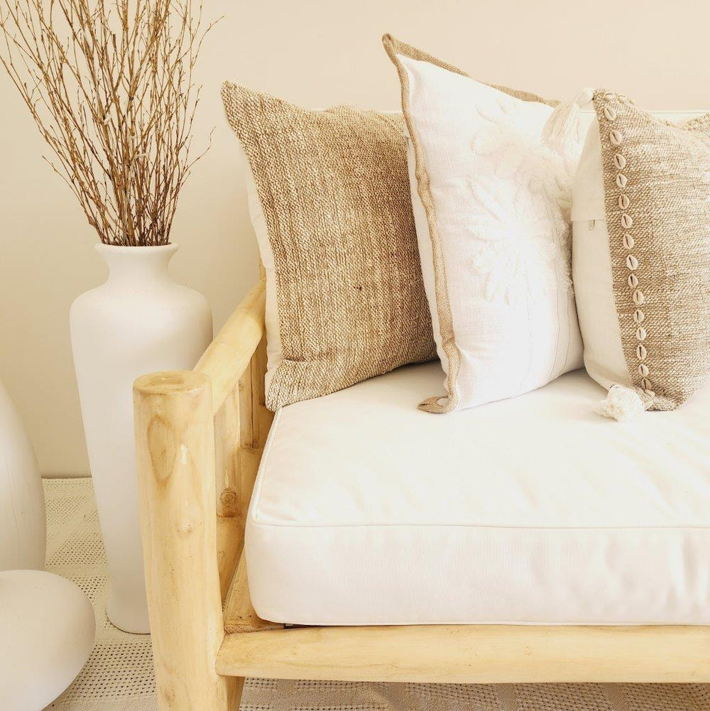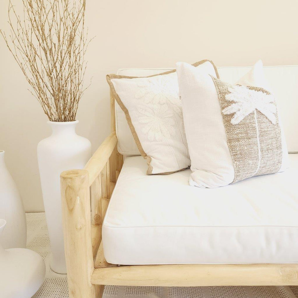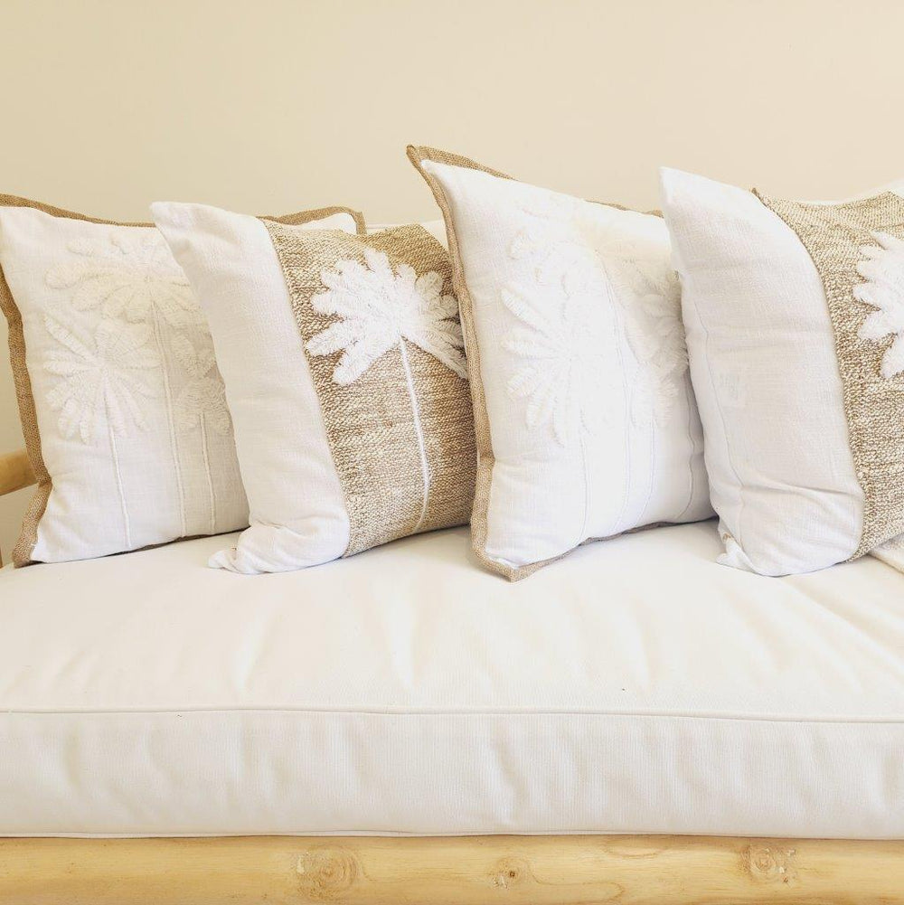 Inspired by the palm lined coasts of Maui, our Maui Cushion Cover features a tufted palm design on soft white cotton with natural jute edging. A perfect blend of boho charm and coastal serenity.