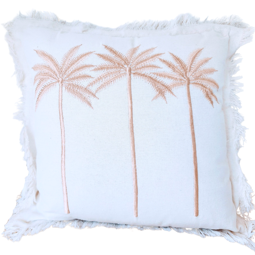 Just another day in paradise! A timeless design with 3 embroidered palms in a golden bronze hue and feature fringing. Made with high quality linen cotton, it pairs beautifully with most of our stunning cushion cover range.