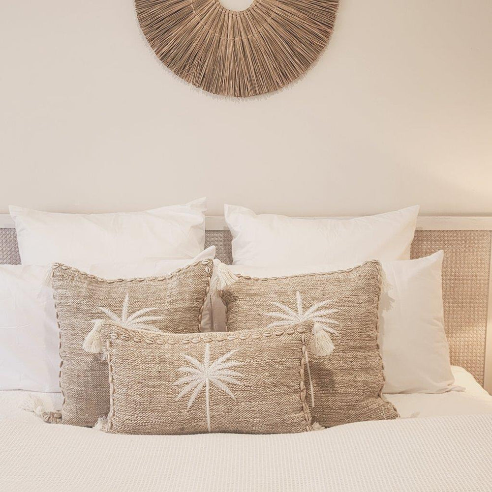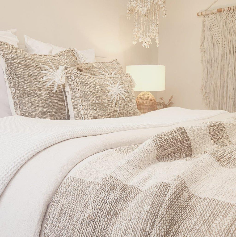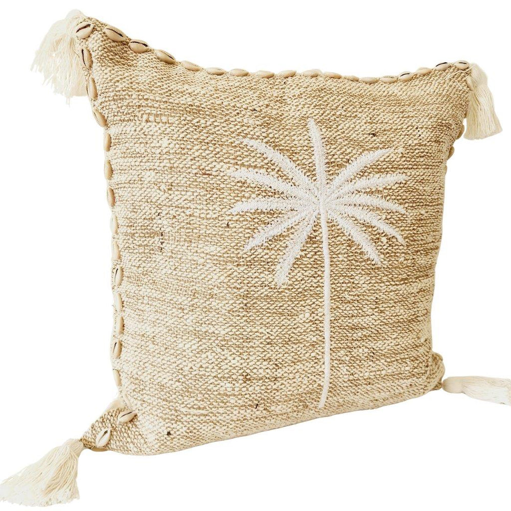 Escape to a tropical oasis with our Paradise Palm Cushion Cover, a statement piece that brings the serene beauty of island living into your home. Handwoven from jute & textured slub cotton, this cushion features white palm embroidery, a timeless symbol of coastal calm and sunny escapes. Cowrie shell detailing along the edges and soft corner tassels add an artisanal touch that captures effortless beachside luxury.