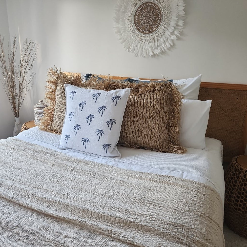 Today’s forecast: 100% chance of sunshine. Keep cool Under The Palms with this stunning cushion cover with multiple embroidered palms in a coastal blue hue. Made from high quality linen cotton it pairs beautifully with most of our stunning cushion range.